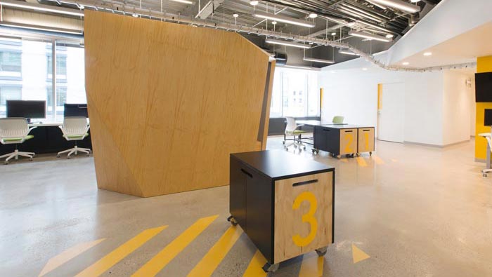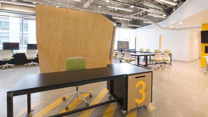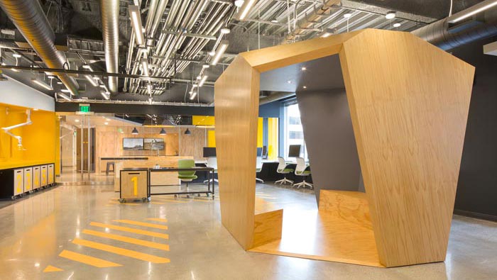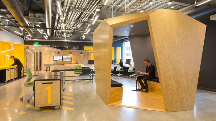 辦公區(qū)域的設計:此時員工已然進入其中開始辦公,其中最大的亮點就是每一個家具是可以動的,不是一成不變的,不要小看一個小小的轱轆,它帶來的是一個變化的空間,根據(jù)研究人在一個地方呆的時間過長,往往會有壓抑創(chuàng)新的能力,因為已然麻木不堪,這是研究開發(fā)的大忌,所以設計師要保持空間時時刻刻的變化。