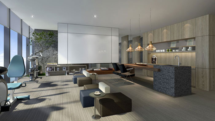 茶水間的設(shè)計,設(shè)計的一大亮點就是設(shè)計本身是冷色系,但是經(jīng)過采光的調(diào)和之后,形成了冷熱交替的新型空間。