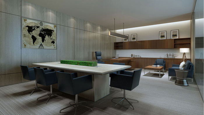 總經(jīng)理辦公室的設(shè)計,設(shè)計師首先了解了總經(jīng)理本人的愛好與需求,之后對空間進行人性化設(shè)計,墻壁地圖的位置的擺放也有很大的講究,寓意以全球眼光看待企業(yè)發(fā)展。