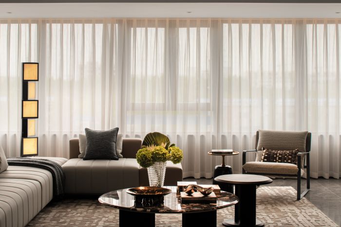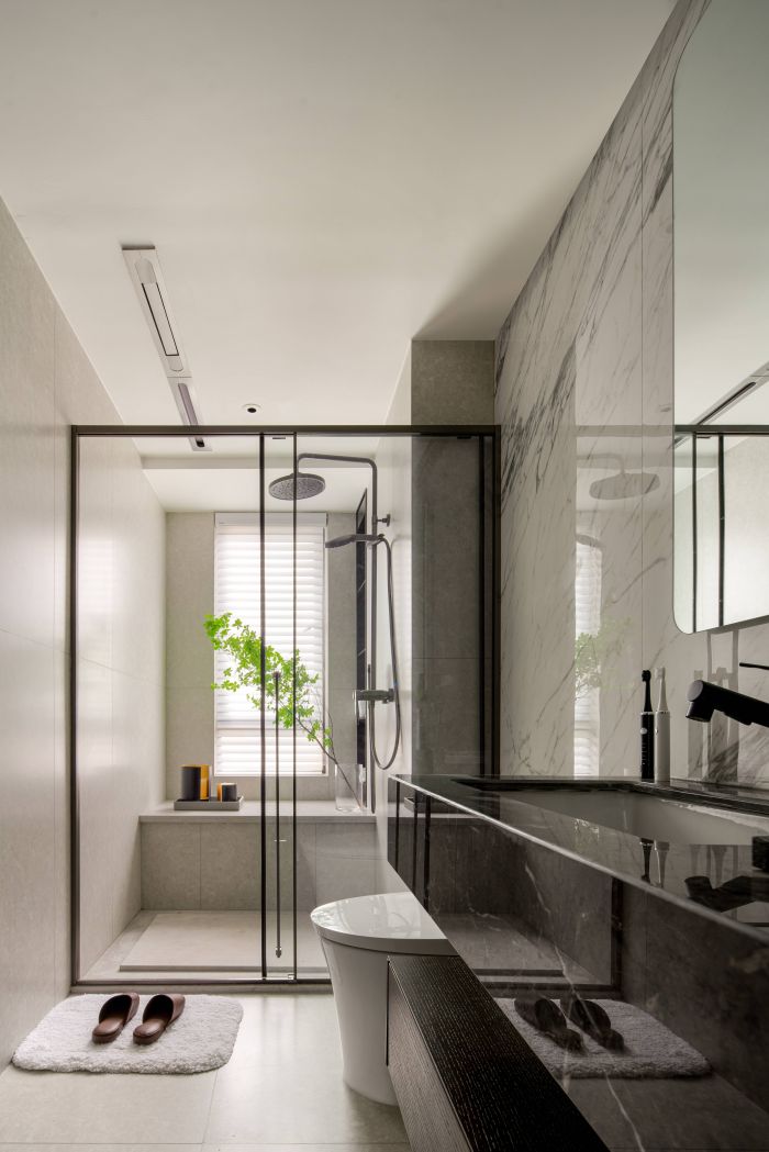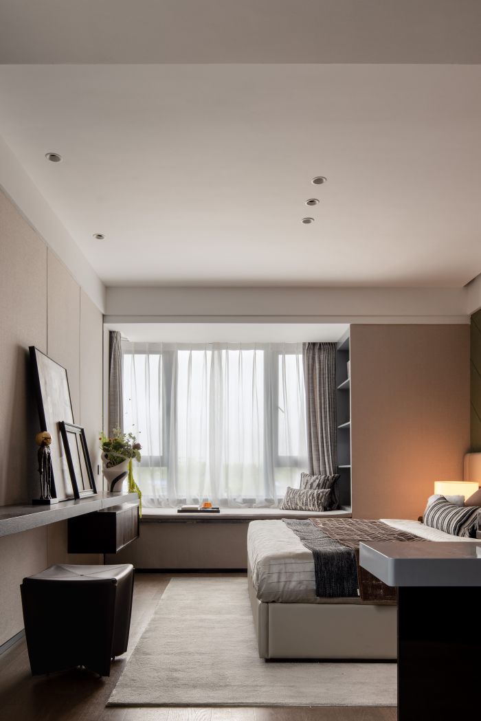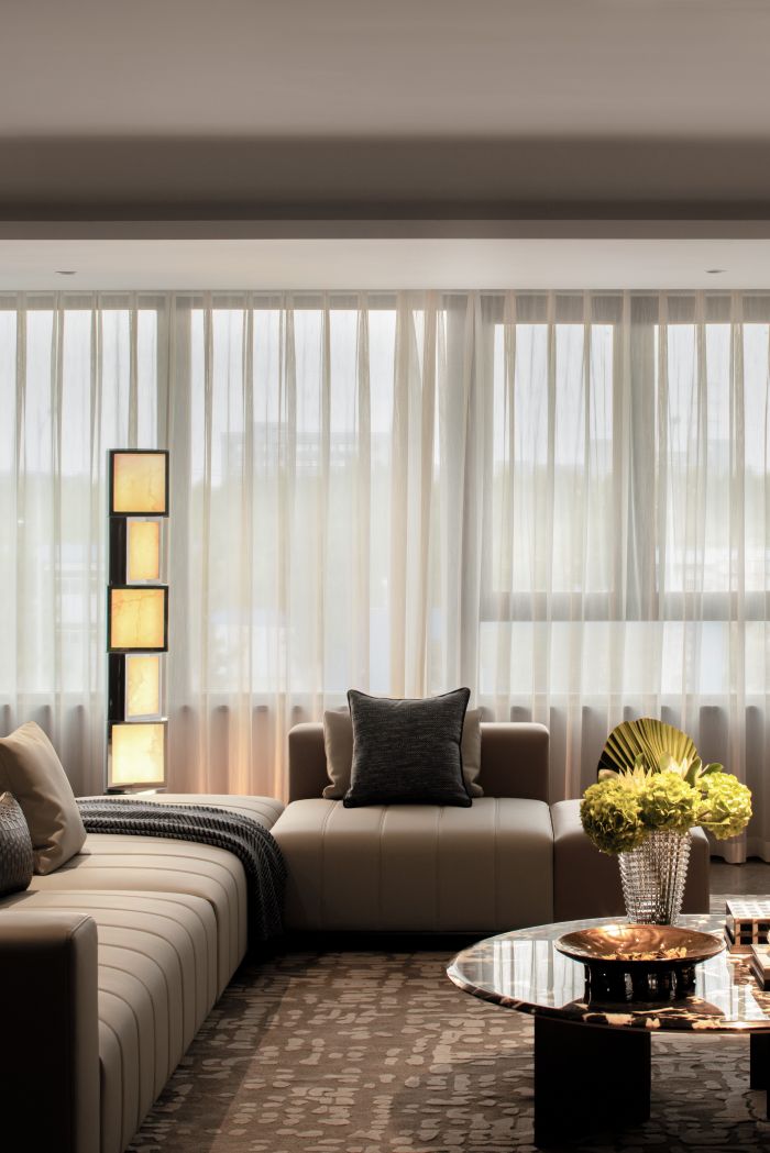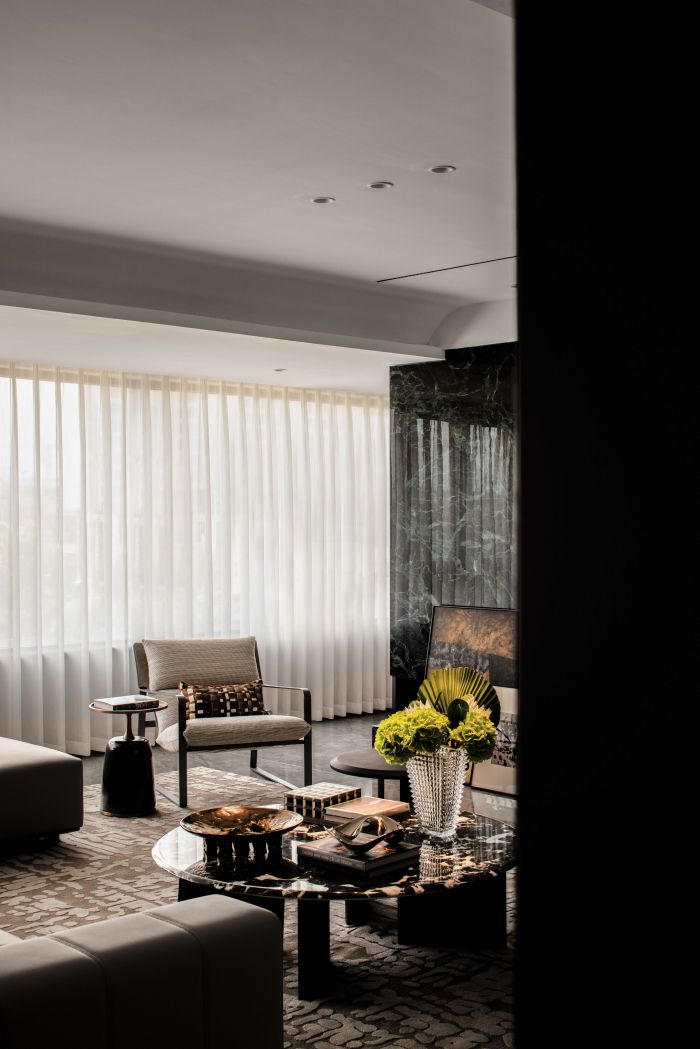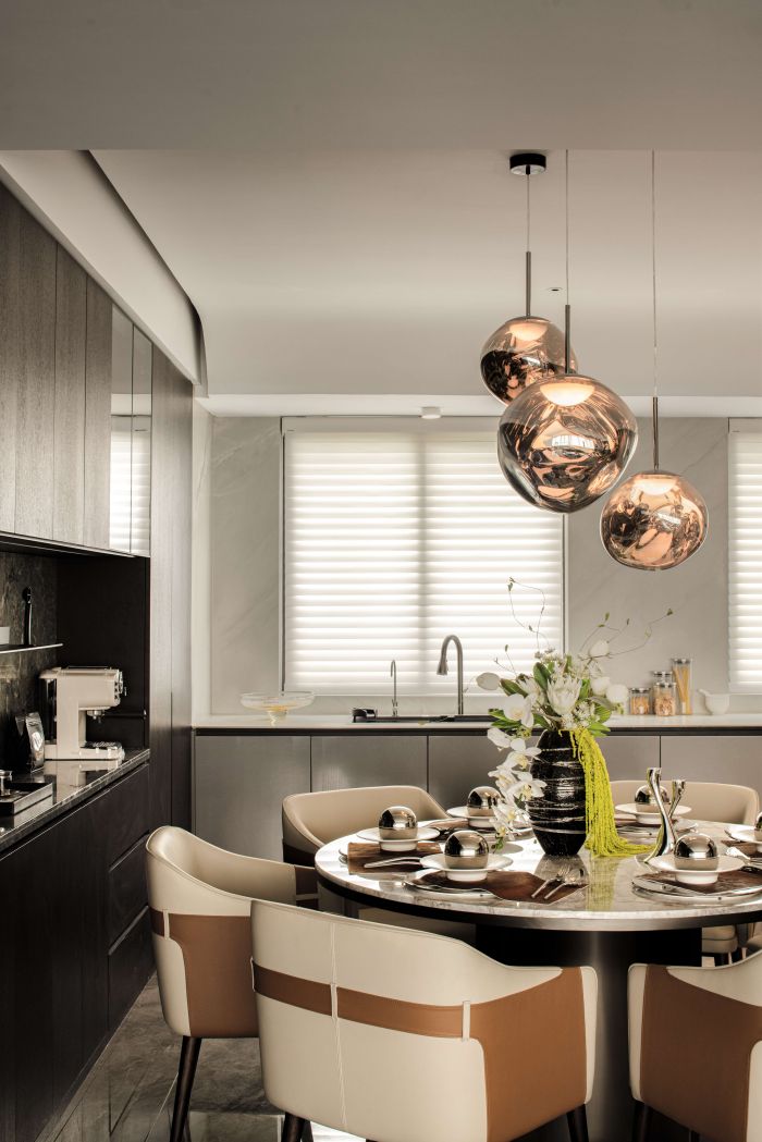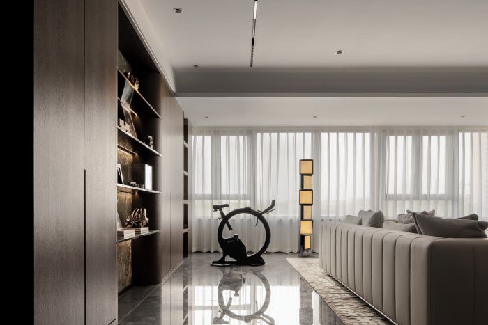 客餐廳整體風(fēng)格現(xiàn)代輕奢,設(shè)計語言采用直線條為主,塊面的分割,給人以簡潔大方的感受。客廳空間整體方正且視野開闊,劃分為會客廳及有氧多功能區(qū)一體,自由且舒適,餐廳區(qū)域為開放式餐廳,中餐及西式操作臺結(jié)合,實現(xiàn)不同的功能需求。地面材質(zhì)公共區(qū)域大面積采用深灰色網(wǎng)紋石材鋪貼,大氣穩(wěn)重。