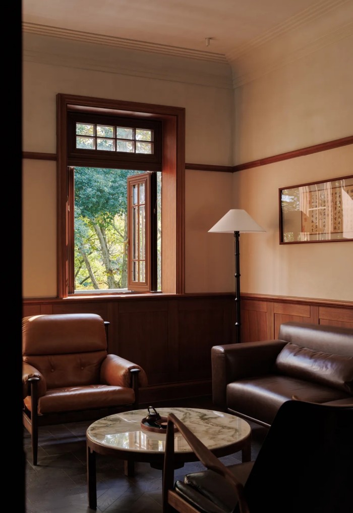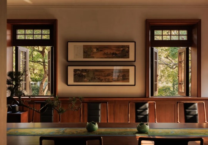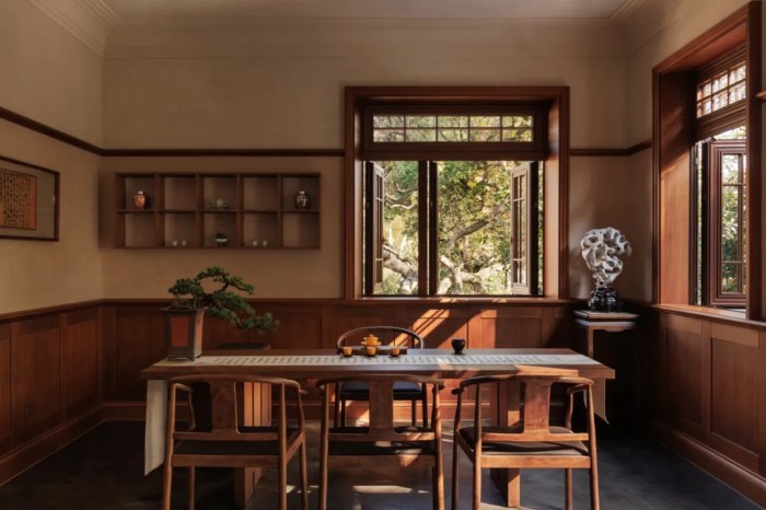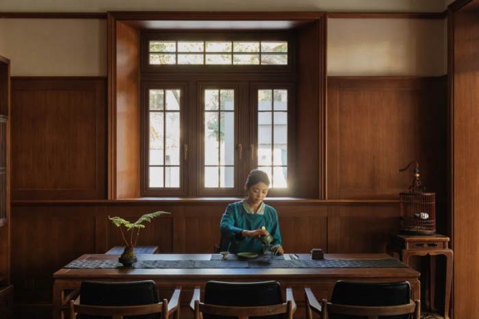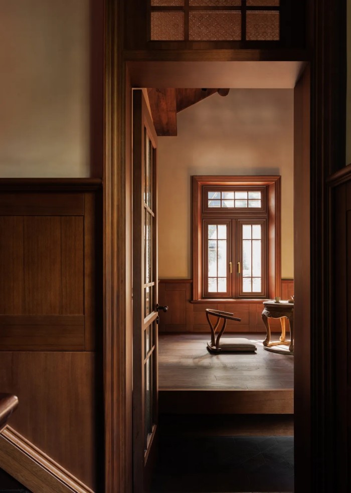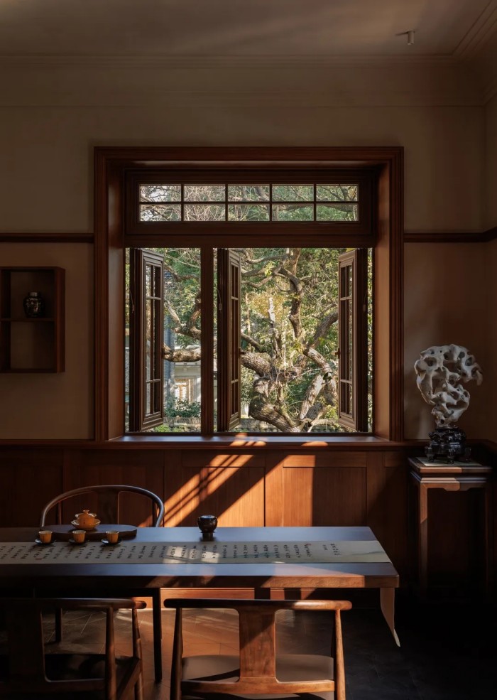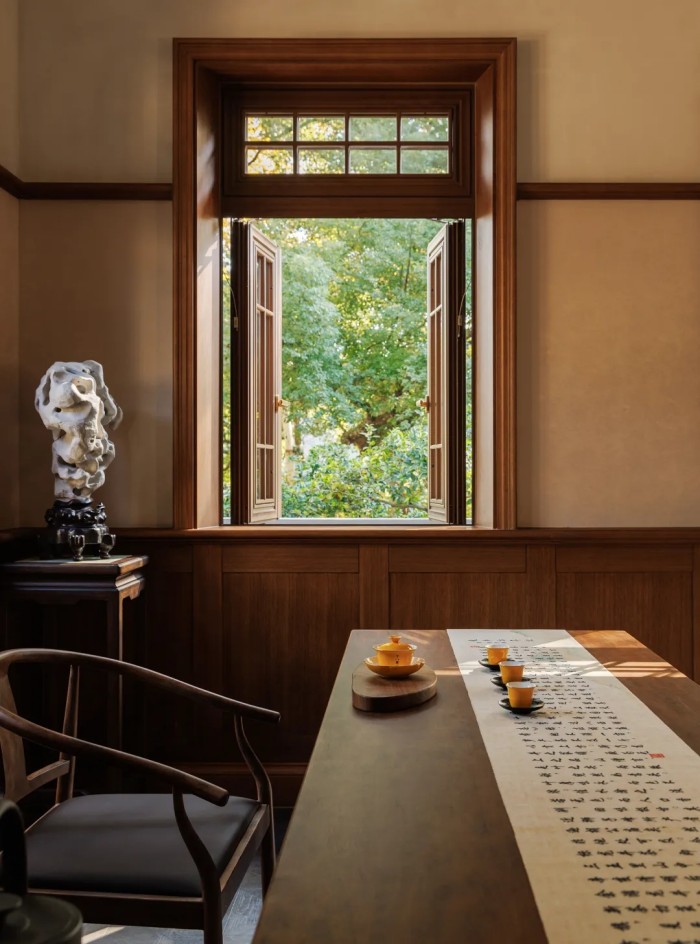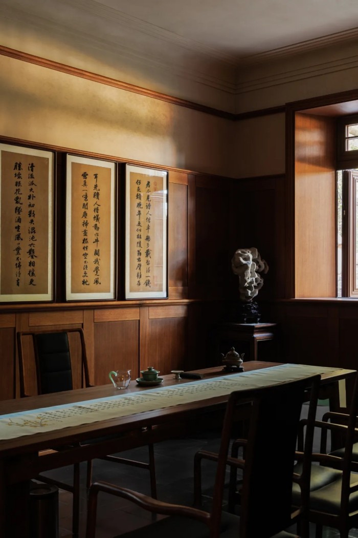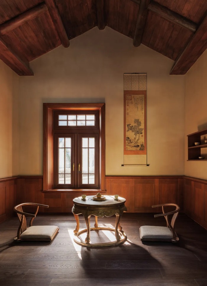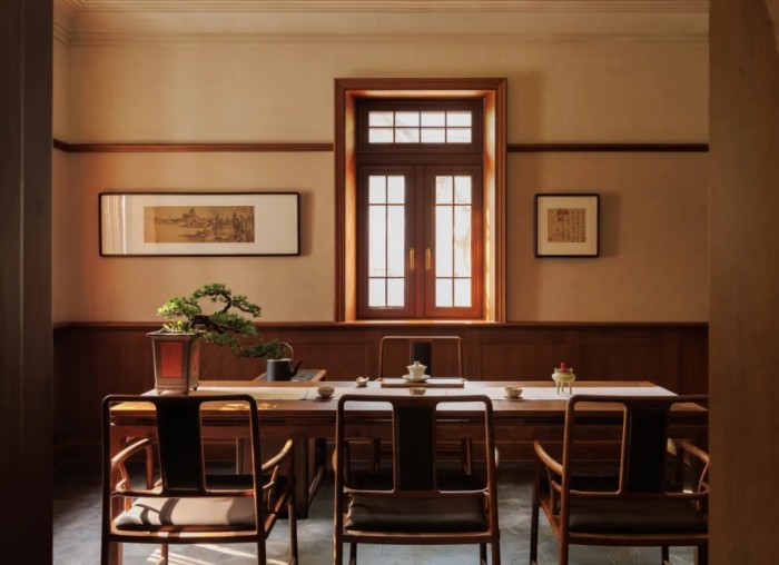 定位經(jīng)營(yíng)中國(guó)頂尖茶。盡管當(dāng)下的茶空間多以東方禪意為主,結(jié)合古建筑的強(qiáng)規(guī)要求,我們選擇順應(yīng)自然,修舊如舊,保持經(jīng)典的民國(guó)建筑風(fēng)貌。在空間中,盡力創(chuàng)造與茶人共融的克制與純粹為設(shè)計(jì)核心。