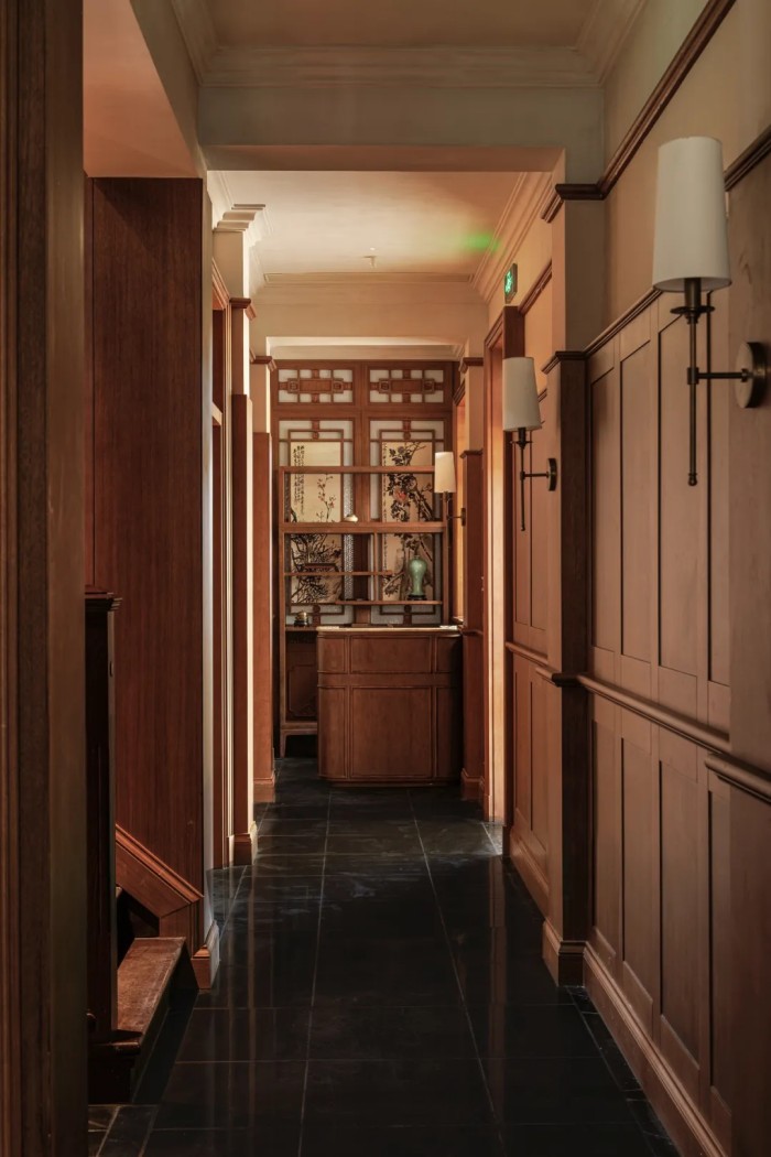 公共區(qū)域的地面采用了金磚,質(zhì)樸中透著古韻;包廂采用煙灰復(fù)合地板拼花,仿佛空間中依舊隱約漂浮著民國(guó)的氣息。
