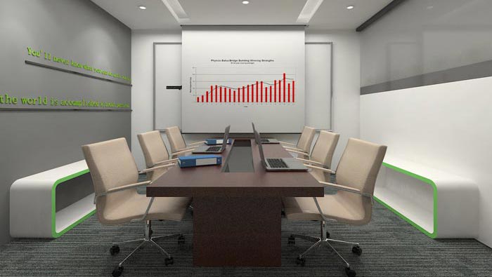 會議室的設(shè)計,設(shè)計師在設(shè)計的時候,將會議桌安置在中心區(qū)域,這樣在保證基本的需求之外,還可以使動線分布在兩端加大空間的活動空間,同時在不影響空間功能的前提下,設(shè)計師利用軟裝來增加空間的承載能力。