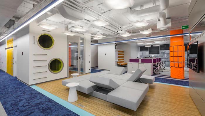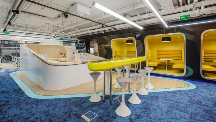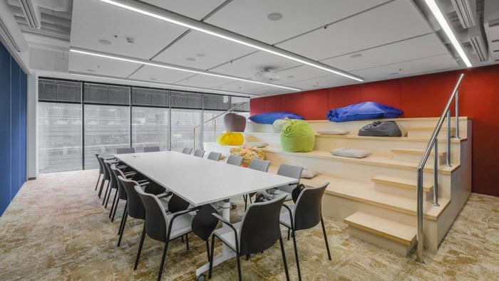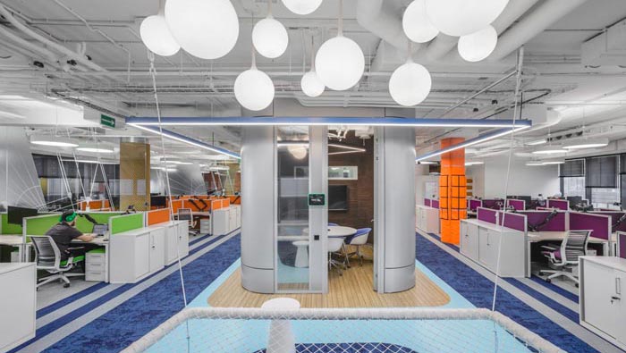 辦公區(qū)域的設(shè)計(jì):設(shè)計(jì)師在設(shè)計(jì)的時(shí)候,將辦公區(qū)安置在空間的兩側(cè),中間部分主要以洽談、休息為主,同時(shí)在辦公區(qū)域設(shè)置的同時(shí),利用色彩的轉(zhuǎn)變來區(qū)分部門的位置,每一個(gè)部門之間都有一定的緩沖地帶,這樣做的目的就是希望在開放的空間內(nèi)保留員工的私人空間。