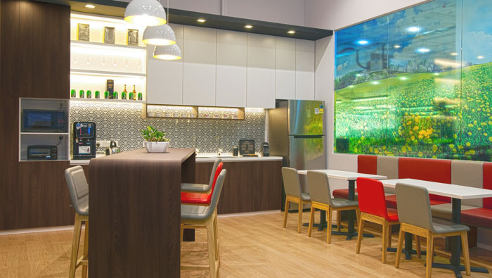 ? 茶水間的設(shè)計:設(shè)計師在設(shè)計的時候,將其安置在一個獨(dú)立的空間之中,這樣設(shè)計的目的就是為了與外界隔絕,設(shè)計師希望讓員工在此處不會受到外界工作壓力的影響,設(shè)計師希望讓員工在此處相互之間交流與工作無關(guān)的話題,讓緊張的腦細(xì)胞得到緩解,設(shè)計師認(rèn)為辦公也需要一張一弛,這樣對于員工的創(chuàng)造性有很大的促進(jìn)作用。