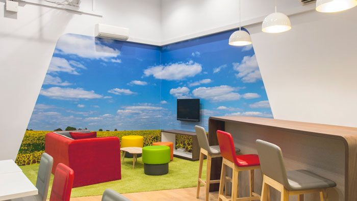 ? 休息區(qū)域的設(shè)計:設(shè)計師在設(shè)計的時候,將其安置在空間的一個角落區(qū)域,設(shè)計師希望在室內(nèi)為員工打造一片凈土,在此地沒有壓力、沒有束縛,設(shè)計師為了達(dá)到這個目的,故此在設(shè)計中采用墻紙的具象使的外景得以在室內(nèi)重現(xiàn)。