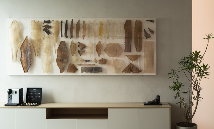 從電梯出來(lái),迎面而來(lái)的就是ECCO的前臺(tái),以長(zhǎng)虹玻璃與其背后影影綽綽的綠植組成了讓人仿若置身雨林的ECCO Forest。輔以ECCO精神內(nèi)含的「皮革創(chuàng)新」,為前臺(tái)打造了一個(gè)特別的皮質(zhì)接待臺(tái)。