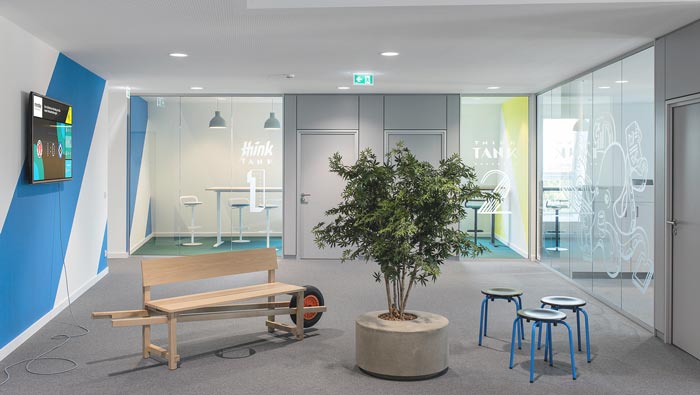 活動(dòng)空間的設(shè)計(jì):此處的活動(dòng)是指空間的活躍性,此處是脫離于企業(yè)之間的空間,此地很好的起到了互補(bǔ)的作用,這也正是此處空間預(yù)留下來(lái)的原因,哪里需要就可以臨時(shí)組成那個(gè)空間,在不需要的時(shí)候可以做為一個(gè)中轉(zhuǎn)站來(lái)使用,在此地不規(guī)則的擺放反而將此地映襯的頗有活力。
