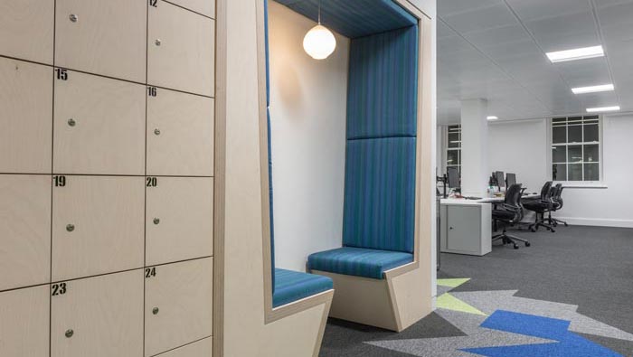 動線的設計:設計師在設計的時候,希望將動線加以利用與開發(fā),故此在設計中在動線區(qū)域加入了休息區(qū)域與儲藏柜,休息區(qū)域即可以做為休息之用,同時也可以做為交流區(qū)域,儲藏柜的設計主要是為了讓員工有一個可以儲藏的空間,可以存放自己的私人物品。