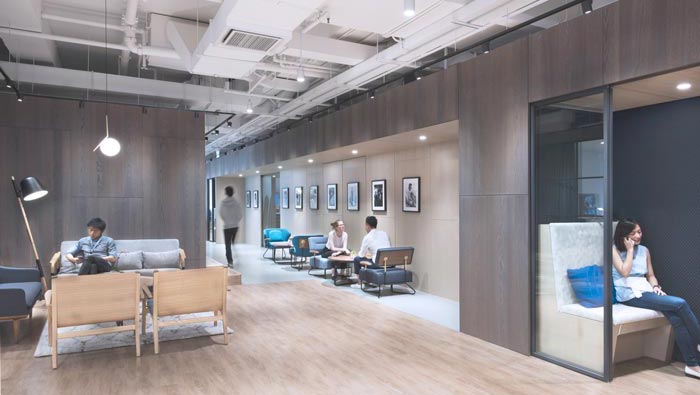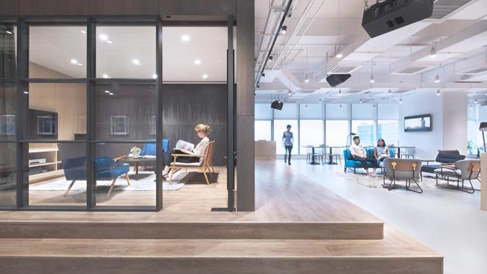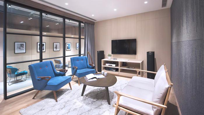 交流區(qū)域的設計:設計師在設計的時候,對交流進行了重新定義,因為在設計師看來交流的前提就是無阻力、無障礙,故此設計師在設計的時候同樣采用極簡的設計手法,目的就是為了打造無阻力的空間,讓交流更加順暢。