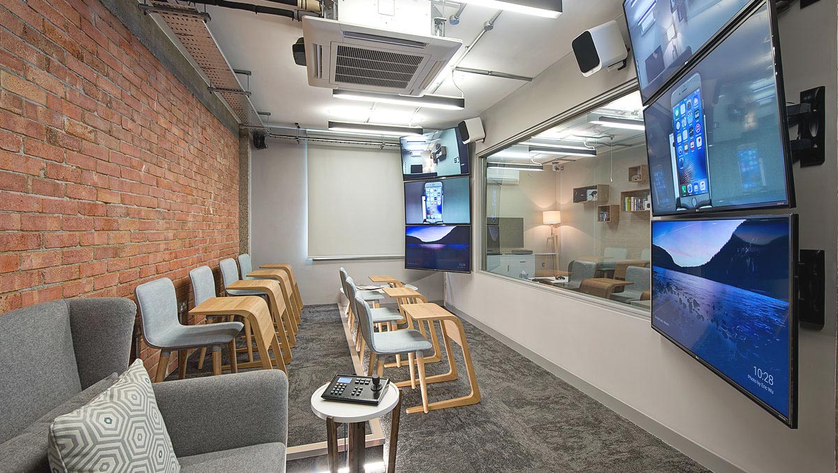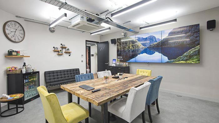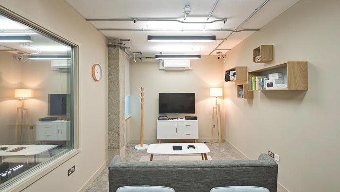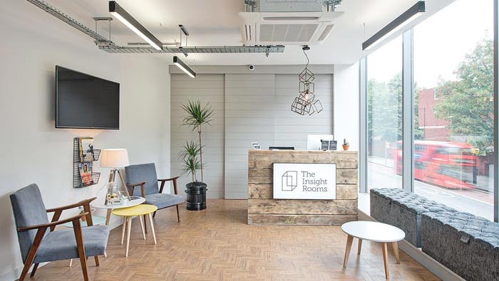 進(jìn)門區(qū)域的設(shè)計(jì):設(shè)計(jì)師在設(shè)計(jì)的時(shí)候,將前臺(tái)與接待區(qū)域融合在一起,這樣設(shè)計(jì)的好處就是可以將兩個(gè)空間濃縮在一起,以此減少空間的負(fù)擔(dān),為其他空間創(chuàng)造出更多的使用空間,客戶進(jìn)門后看到的就是the insight rooms(洞察室),這樣表現(xiàn)了企業(yè)的文化與追求,企業(yè)希望在不斷的探索與洞察當(dāng)中為未來(lái)做出一定的推測(cè)。