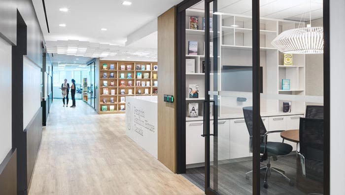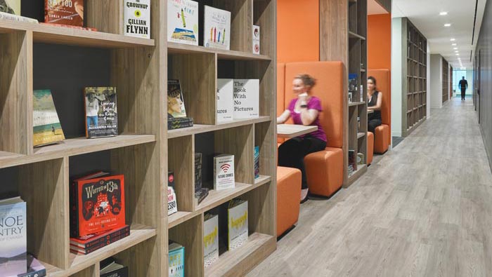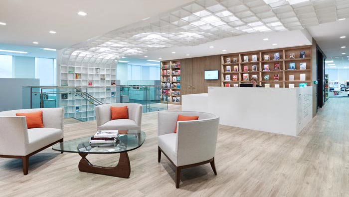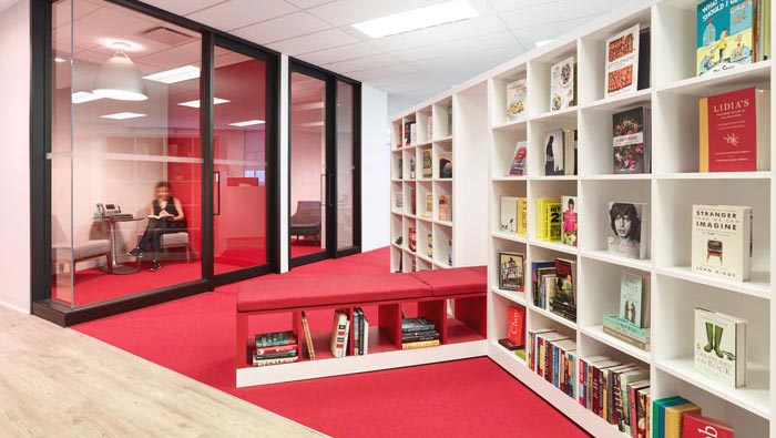 辦公區(qū)域的設(shè)計(jì):設(shè)計(jì)師在設(shè)計(jì)的時(shí)候,為了更加方便員工的編輯、收集、閱讀,設(shè)計(jì)師將辦公工位與書架結(jié)合在一起,這樣的好處就是讓員工與書籍之間沒有了阻隔,更加方便彼此之前的協(xié)作,公共工位有書桌式的、有沙發(fā)式的,讓員工可以按照自己的習(xí)慣進(jìn)行工作,讓員工在工作的同時(shí)更加貼近自己。