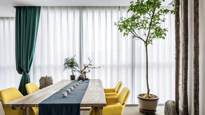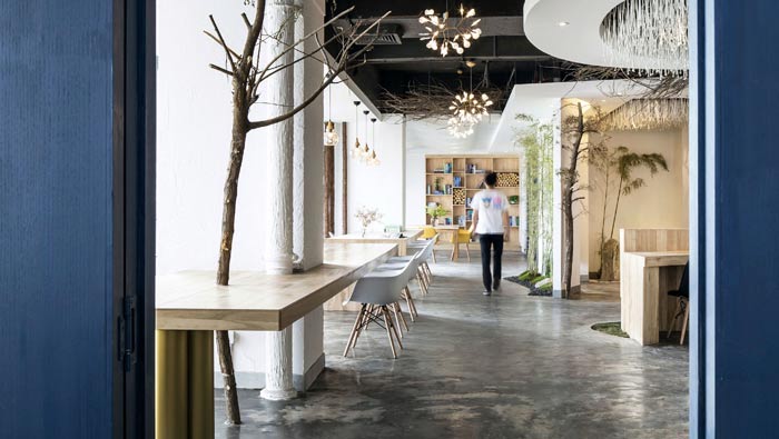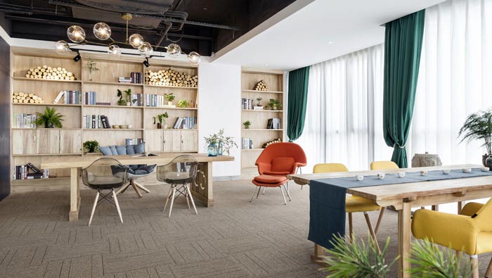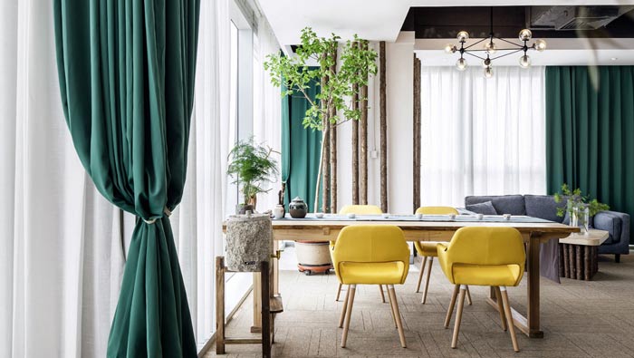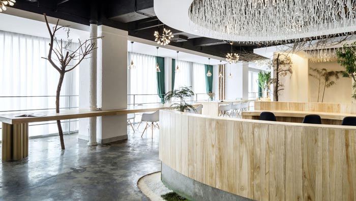 環(huán)保公司辦公室左側(cè)設(shè)計:前臺位于空間的中央,往左走看到的有樹木、綠竹與燈光組成的開放式辦公空間,三者相互結(jié)合在一起,無形中增加了空間幽深之感,在點綴空間的同時,也加深了空間的視覺感受。