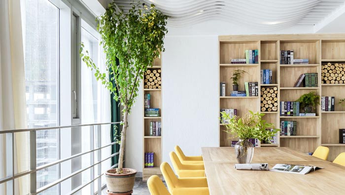 環(huán)保公司辦公室左側(cè)辦公區(qū)設(shè)計:此處位于內(nèi)部左側(cè)區(qū)域,在這里我們夢寐已久的自然達到頂峰,陽光照入室內(nèi)、綠植光鮮奪目,木材散發(fā)著時間的年輪,一切的一切無不在訴說自然的美好。