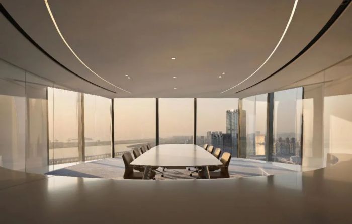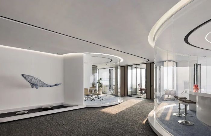 設(shè)計(jì)風(fēng)格采用大而平順的弧度和圓潤的造型,注入了柔性力量??臻g中充滿海洋文化的氣息,懸吊的鯨魚藝術(shù)裝置成為空間的導(dǎo)言,歡迎人們深入其中。員工區(qū)呈現(xiàn)開放交流的狀態(tài),便于員工間的密切合作。整體的空間型態(tài),如展翅的鯤鵬翱翔于大海之畔。