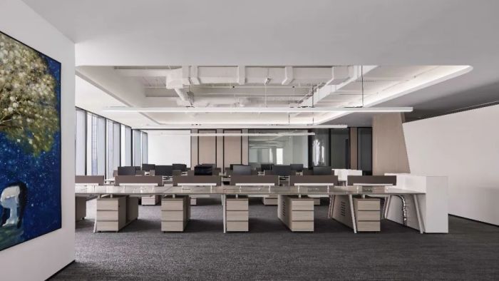 這是一個(gè)金融行業(yè)公司的辦公室,有1100方的面積。設(shè)計(jì)目的是營造舒適健康的金融商務(wù)空間,并體現(xiàn)一種帶有大地藝術(shù)氣質(zhì)的室內(nèi)美學(xué)。