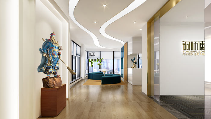 工藝品辦公室前臺(tái)設(shè)計(jì):logo位于進(jìn)門區(qū)的墻壁之上,這里視線最好,久煉成器,造化人銅表明了企業(yè)的理念與屬性,關(guān)公工藝品純手工打造,以絲絲入微的鑄銅工藝,凝練出方寸間的張弛氣度。