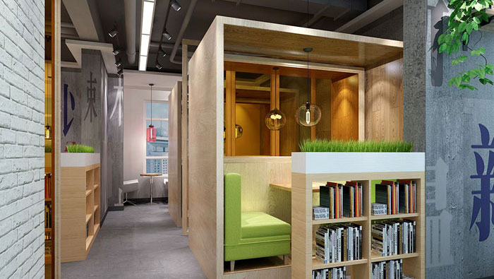 前臺(tái)過(guò)道的設(shè)計(jì),設(shè)計(jì)師利用融合的方式,將休息區(qū)域延伸到過(guò)道,一則對(duì)空間利用到極致,二則凸顯了人性化設(shè)計(jì)。