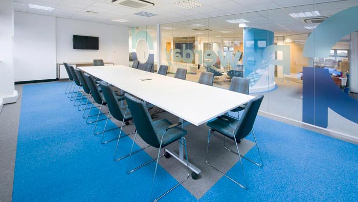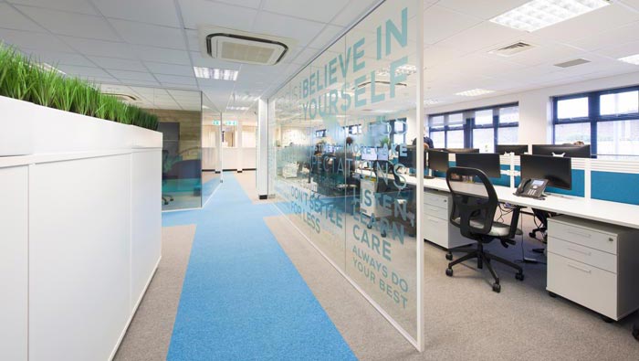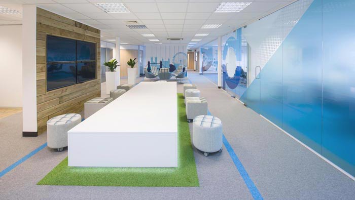 科技公司辦公室動線設計:設計師在設計的時候,動線大致分為十字進行分布,這樣布局的原因就是空間格局是成一個個的小格子分布,故此采用十字形動線,在同時設計師為了圈定動線的安全區(qū)域,故此使用淺藍色地毯引導客戶與企業(yè)前行。