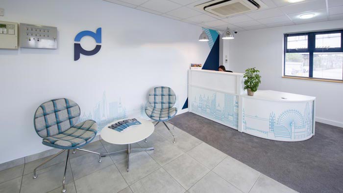 科技公司辦公室前臺設計:設計師在設計的時候,將前臺設置在空間的一個角落,在設計師看來這樣的設計可以讓客戶進入后有一個緩沖時間,以此為下一步的合作與交流提供良好的基礎。
