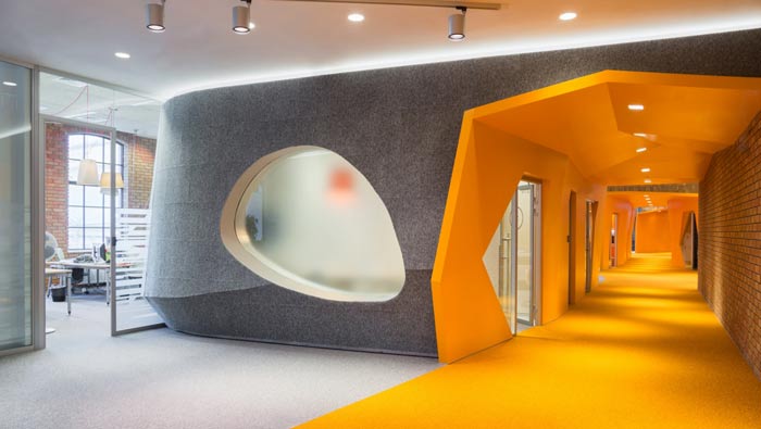 科技公司辦公室過道設計:橙色的過道設計,讓空間顯得十分夢幻,橙色是暖色系中最溫暖的顏色,它使人聯(lián)想到金色的秋天,豐碩的果實,是一種富足、快樂而幸福的顏色,寓意企業(yè)會讓客戶滿載而歸。