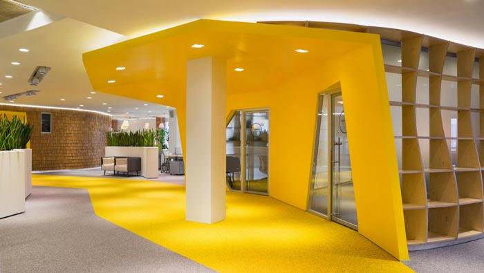 科技公司辦公室休息區(qū)設計:一排排座椅擺在空間的邊緣地區(qū),在這里員工可以休息、聊天、閱讀,想做什么都可以,設計師希望員工在這里可以忘記煩惱,哪怕只是片刻,片刻的輕松在如今真是千金難求。