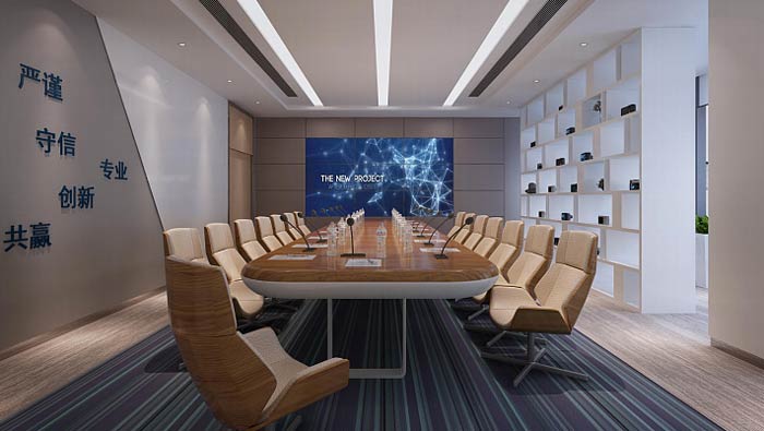 科技辦公室會議室設(shè)計:會議室簡潔、大氣的設(shè)計,更能滿足企業(yè)對于會議室的需求,墻面嚴(yán)謹(jǐn)、守信、專業(yè)、創(chuàng)新、共贏,體現(xiàn)了企業(yè)文化特征,咖啡色的會議桌彰顯高雅。
