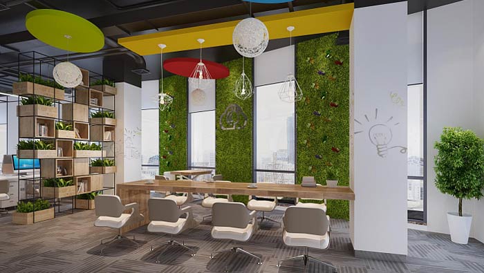 科技辦公室休閑區(qū)設(shè)計:休閑區(qū)采用簡單的造型、與色彩相互搭配,使的整個空間高效、嚴(yán)謹(jǐn),休閑空間有休閑、辦公兩種屬性,綠植墻的出現(xiàn),是為了減輕長時間看電腦的視覺疲勞。