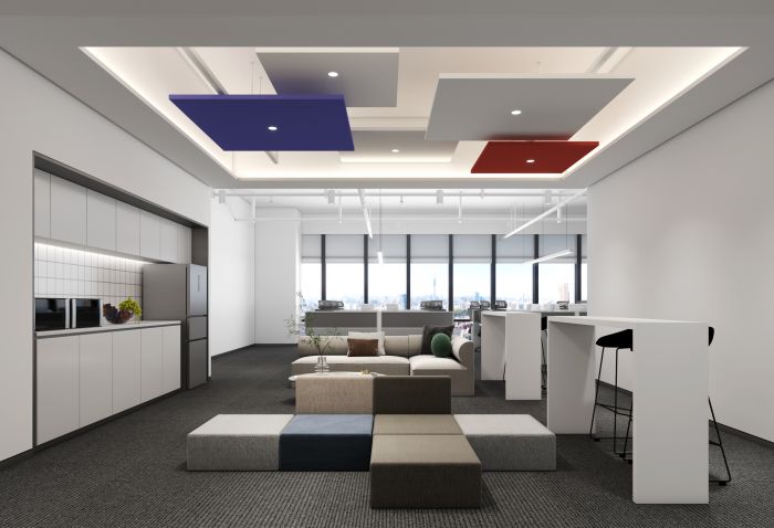 這是一家電子制造業(yè)公司辦公室裝修設(shè)計案例,空間面積900平方米。設(shè)計以公司標(biāo)志為靈感,使用了標(biāo)志的顏色和結(jié)構(gòu),并且融合在平面設(shè)計和家具配置中。