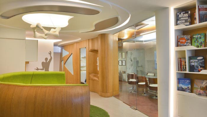 接待區(qū)域的設(shè)計(jì):設(shè)計(jì)師在設(shè)計(jì)的時(shí)候,將其安置在前臺(tái)區(qū)域的后方,在形狀的選擇上,設(shè)計(jì)師選用了半圓形,在設(shè)計(jì)師看來(lái)這樣的設(shè)計(jì)有其天然的優(yōu)越性,半圓形在此處瞬間感覺(jué)空間突然上升了一個(gè)層次,同時(shí)又不會(huì)對(duì)整體空間造成影響,做到實(shí)用與形象并存。