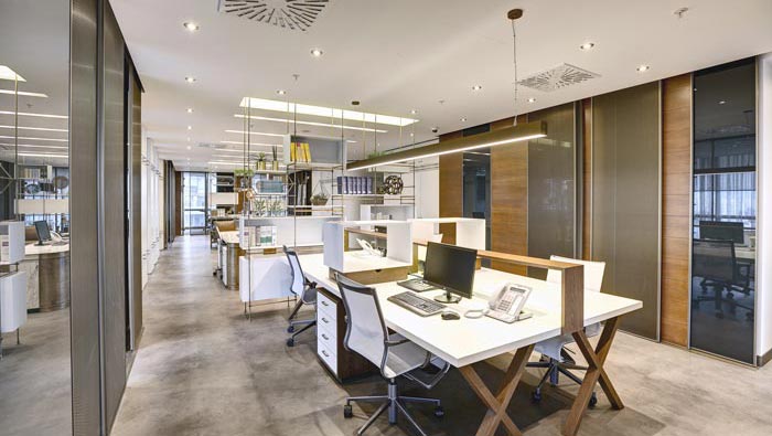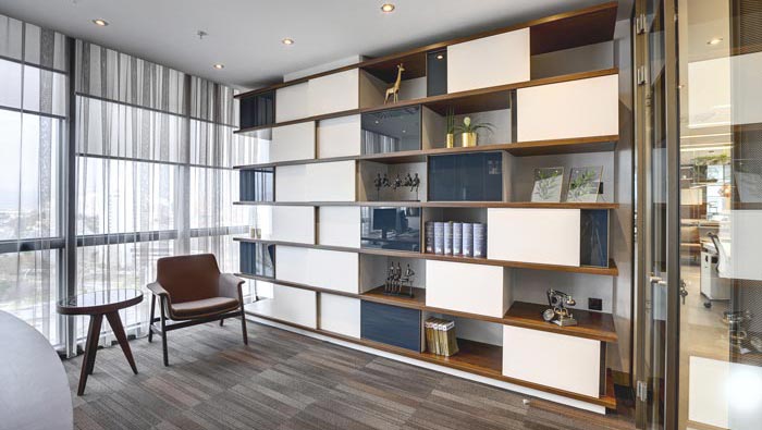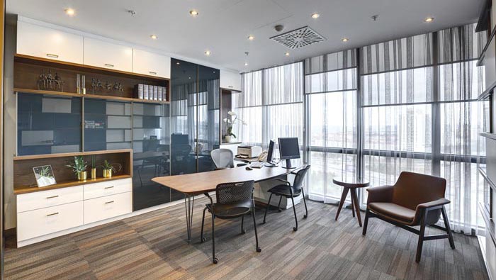 俯視整個總經理辦公室的設計:可以看出整個空間在設計師的設計手法之下變得越發(fā)精致,每一處都宛若天成,每一處與每一處的配合都是那么的契合,當窗簾拉開的那一瞬間,陽光瞬間將整個空間照射的一覽無余,一覽無余的設計、功能齊全的設計,兩個看似矛盾的場景同時出現在一個空間,不得不讓人嘆服。