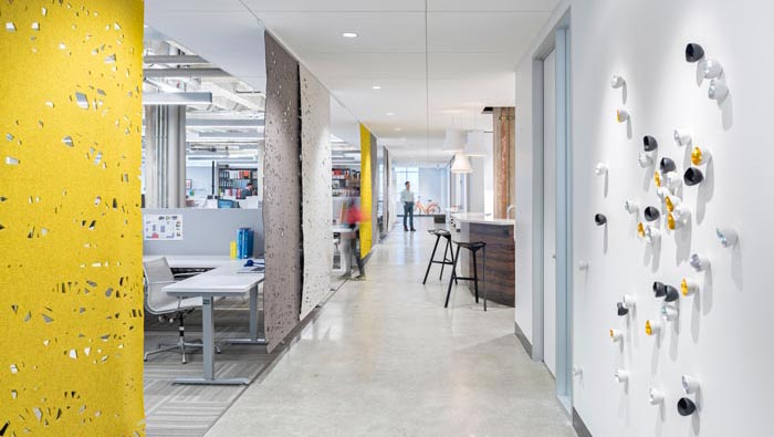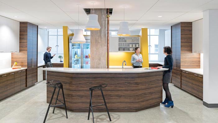 茶水間的設(shè)計(jì):設(shè)計(jì)師在設(shè)計(jì)的時(shí)候,將其安置在空間的中心區(qū)域,此處可以說(shuō)是空間的一個(gè)中心聚集地,在設(shè)計(jì)師看來(lái)茶水間是企業(yè)為數(shù)不多的無(wú)壓力場(chǎng)所,吧臺(tái)本身也有休息、娛樂(lè)的意味,設(shè)計(jì)師希望讓員工在此處可以相互交流、相互了解,以此增加企業(yè)的內(nèi)部向心力。