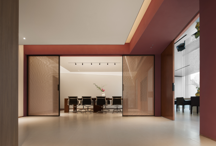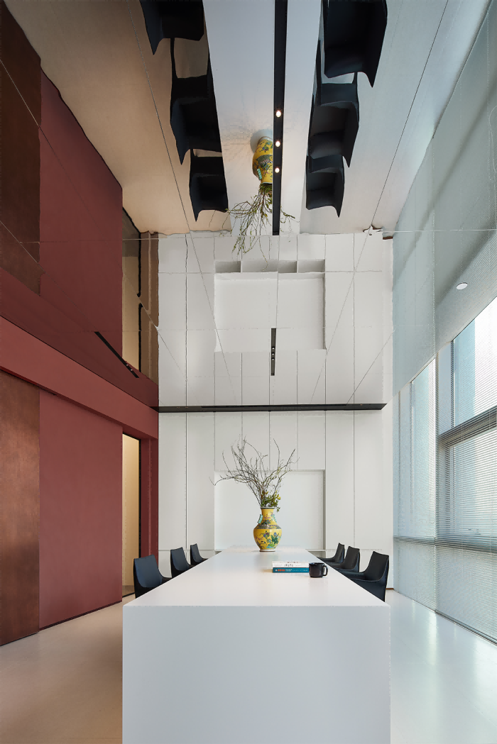 辦公室不同于尋常的辦公空間,以體驗式的空間形態(tài)呈現(xiàn),情緒逐漸由外至內(nèi)轉(zhuǎn)變,變得安靜柔和。在感知層面,設(shè)計師通過設(shè)置明顯斜角和落地窗前的斑駁光波反射,增加空間的層次感和立體感。在視覺層面,設(shè)計師通過斜面的設(shè)置和不同材質(zhì)的運(yùn)用,改變空間的視覺效果,增添更多表現(xiàn)力和質(zhì)感。在敘事層面,設(shè)計師通過創(chuàng)造一個有趣的空間邏輯,將生活融入空間的細(xì)節(jié)中,讓使用者自主發(fā)現(xiàn)。