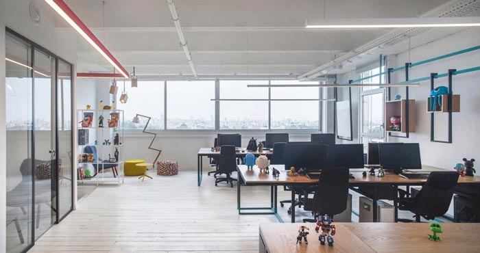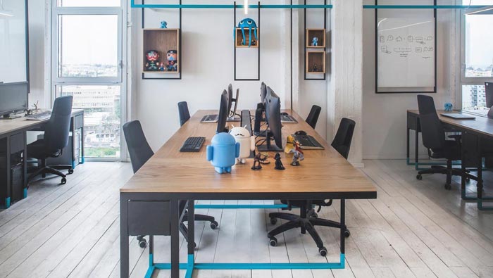 260平方辦公室辦公區(qū)設計:異形的辦公桌,可以打破空間中規(guī)中矩的感覺,雖然只是桌底一點點的異形,但是也讓空間的形象截然不同,每一個辦公桌都差不多多出來將近20公分,目的就是擺放各種各樣的游戲模型,讓員工在勞累的時候可以養(yǎng)神、養(yǎng)眼。