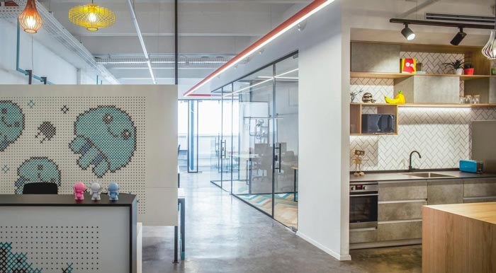 260平方辦公室接待區(qū)設計:此處給人的第一感覺就是活潑、可愛,游戲人物的出現讓我們仿佛回到了童年一般,讓往事在我們的腦海中重現,目的就是希望員工可以時刻保持一顆童心,孩子的創(chuàng)造力是無以倫比的。