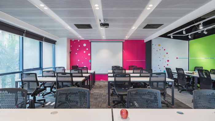 大會議室的設(shè)計:本次設(shè)計設(shè)計師參考了教室的布局模式,這也是設(shè)計師不得已而為之,由于空間的面積十分有限,故此設(shè)計師只能采用比較保守的設(shè)計,以此設(shè)計可以順利的進(jìn)行下去,同時設(shè)計師在原有的基礎(chǔ)上,增加了自己對于光學(xué)的認(rèn)識,目的就是希望在保守之際,為空間帶來一絲生機。