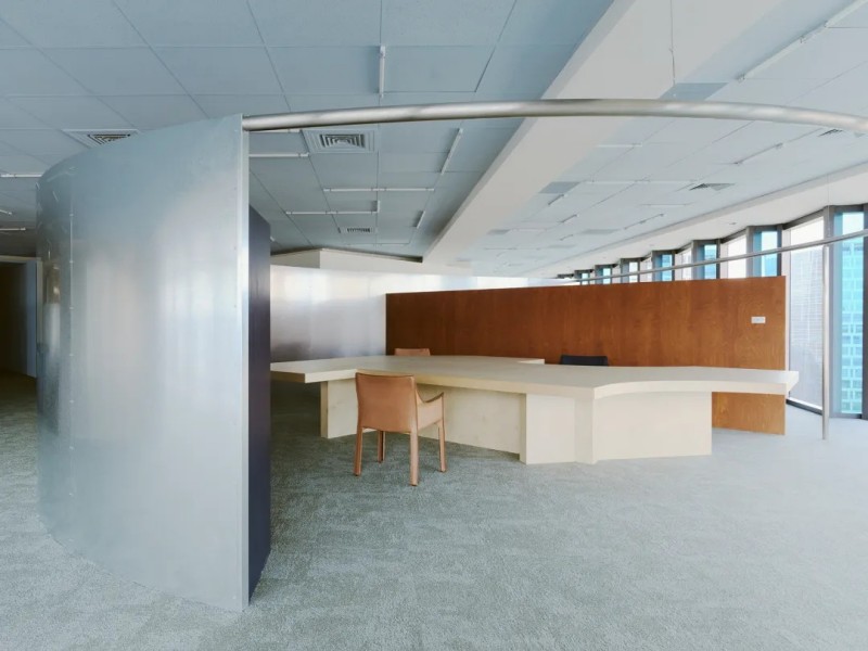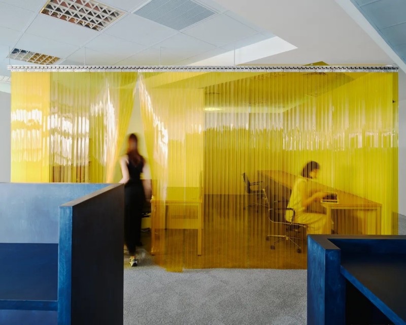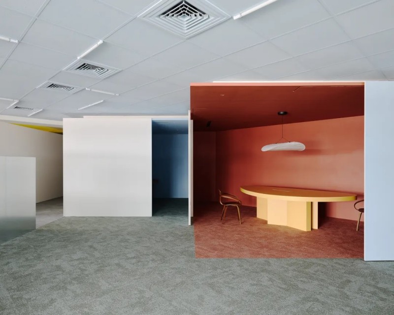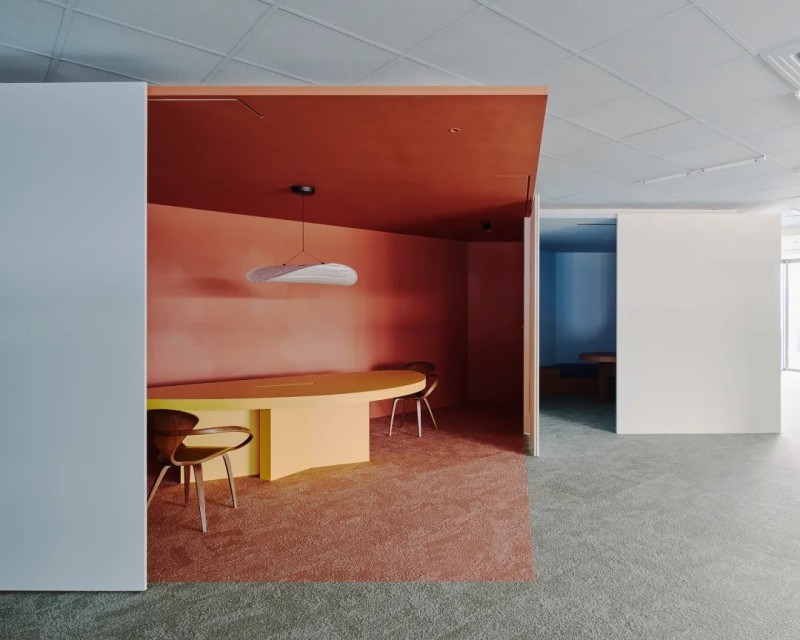在假期國際的辦公空間設(shè)計(jì)邏輯中,設(shè)計(jì)師拋開辦公室點(diǎn)到點(diǎn)、格狀切割空間的形式,改以回繞、非定向的空間路線制造蜿蜒,讓使用者行走間對(duì)環(huán)境產(chǎn)生「探索」之感,而非傳統(tǒng)僅求效率、壓縮個(gè)體感受的工作環(huán)境。設(shè)計(jì)師希望透過回繞行走,即使座位至茶水間的片刻都能讓緊湊生活得到喘息節(jié)奏,如同自我療愈的儀式。