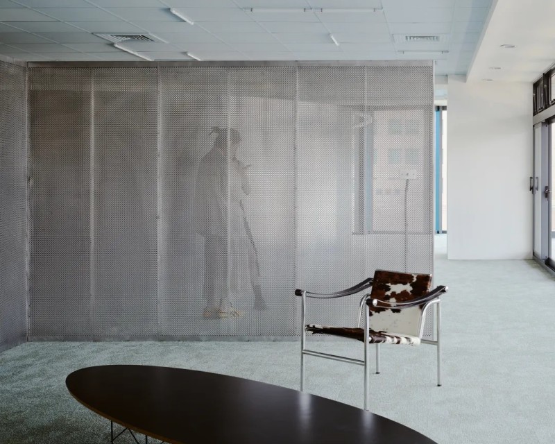 為此,設(shè)計(jì)師將入口臨窗西曬側(cè)設(shè)定為短暫停留的動(dòng)線區(qū),讓工作位置脫開日曬范圍,別于傳統(tǒng)接待柜臺(tái)及等候區(qū)模組,我們?cè)O(shè)計(jì)幾座高背座椅建構(gòu)這段過度空間,這些看似隨機(jī)的塊面如雕塑錯(cuò)落于窗邊,比固定隔間更具靈活性,其造型易于控制屏蔽比重又能遮陽,訪客候位可于椅陰影乘涼,業(yè)主也能利用如墻形式配置品牌訊息。