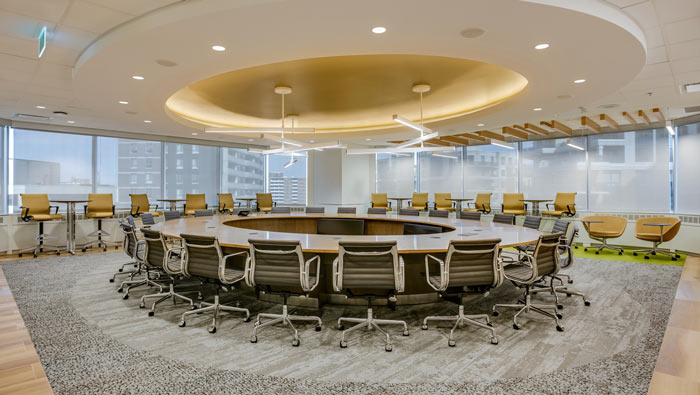 會議室效果圖:圓形的會議桌椅占據(jù)了空間的中心區(qū)域,將空間的中心完美的使用起來,外環(huán)設(shè)計師利用吧臺桌椅搭建一個環(huán)形的座椅,以此加大會議室的實用率。