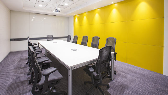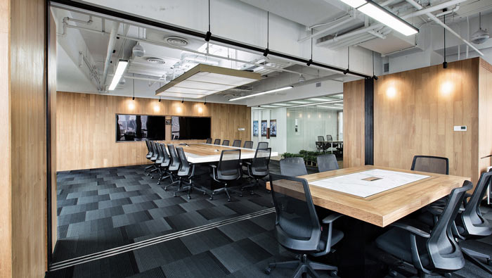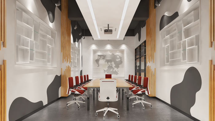 會議室設(shè)計效果圖:白色讓整個空間明亮、大氣,黑色在此次與白色遙相呼應(yīng),將空間映襯的更加明亮,在設(shè)計師看來顏色之間的互相搭配,可以換發(fā)新的生機。