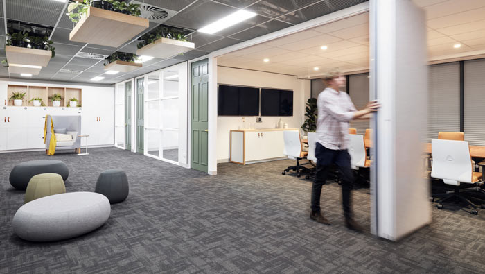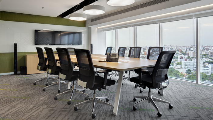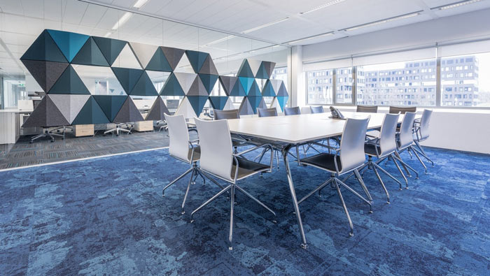 辦公會議室裝修效果圖:由顏色框定的會議空間,正是設(shè)計師為企業(yè)專門定制的,這樣可以減少隔墻對空間的影響,斜放的會議桌椅,讓空間不會那么呆板。