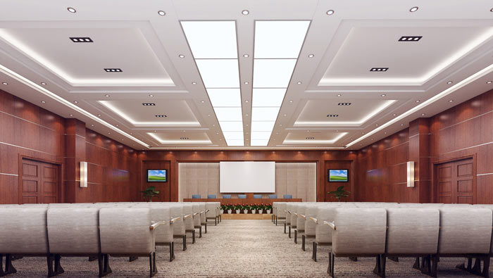 多功能會(huì)議室裝修設(shè)計(jì):整齊是空間的基本元素,設(shè)計(jì)師既要保證參會(huì)區(qū)的前后對(duì)應(yīng),同時(shí)也要保證空間的整齊劃一,這考驗(yàn)著設(shè)計(jì)師的整體掌控能力。